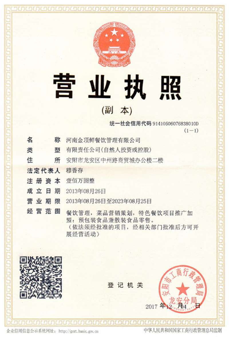 隸屬于河南金頂鮮餐飲管理有限公司所持有.