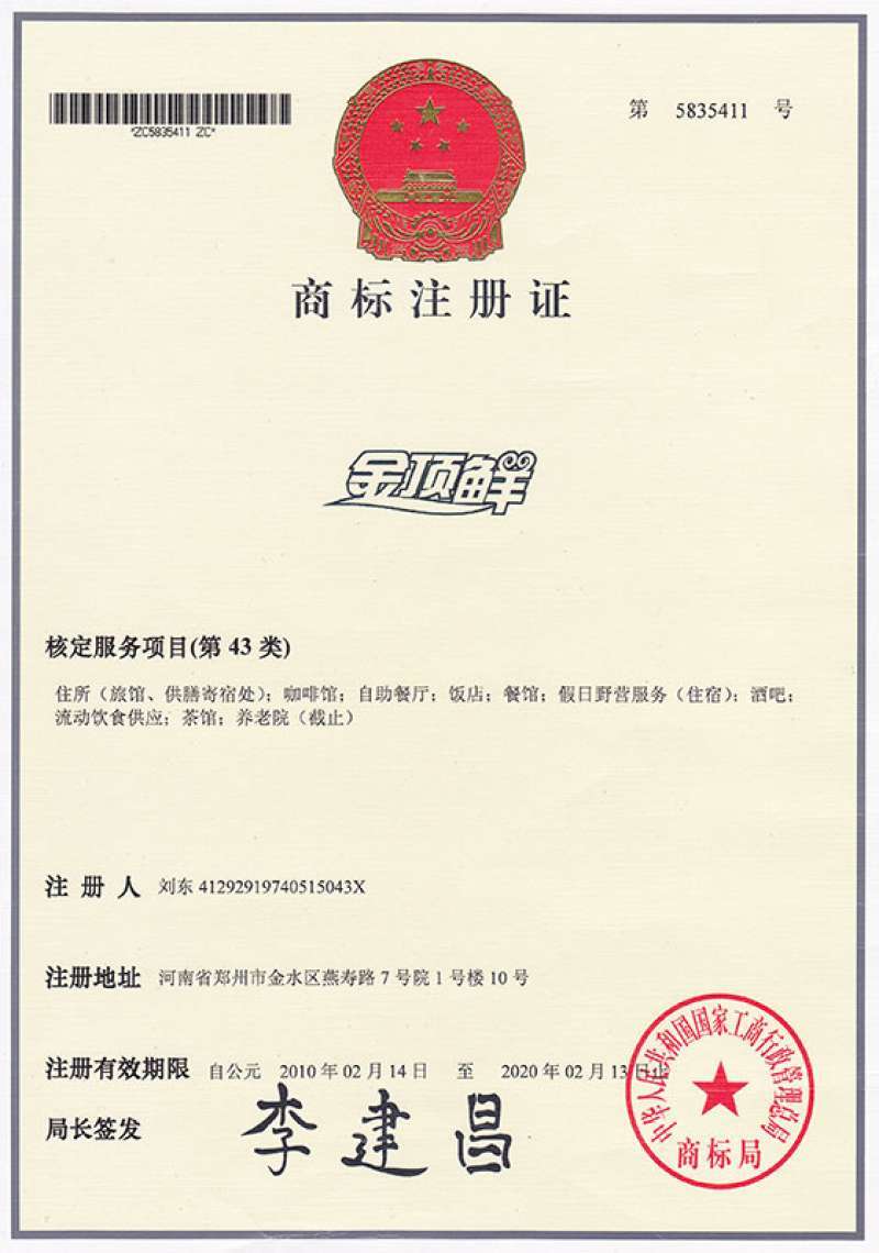 2002年創(chuàng)始人穆香存女士為把事業(yè)做大做強(qiáng),把祖?zhèn)骱途难邪l(fā)的項目推向市場,決定走連鎖加盟發(fā)展道路,讓有能力的人、熱愛餐飲行業(yè)的人來運(yùn)作。2003年元月份起,金頂鮮寧夏系列特色項目在河南首先推廣開來,2006年改組成立股份制企業(yè),注冊“金頂鮮”系列商標(biāo),2010年2月14日公司拿到首個商標(biāo)證(國家商標(biāo)是全國唯一性的,全國只能有一個商標(biāo)證,早期注冊需用時3年左右,現(xiàn)在政府效率高,從注冊日期算起,大概兩年下來商標(biāo)大證)。公司在隨后經(jīng)營發(fā)展的幾年,又陸續(xù)花巨資注冊/并購50多個商標(biāo)來保護(hù)自主品牌。“胡羊排“就是典型代表,2013年8月份向國家商標(biāo)局遞交申請,2015年12月21日“胡羊排”商標(biāo)成功注冊。目前遍及河南、河北、山西、山東、安徽、浙江、江蘇、陜西、廣西、東北、甘肅、江西、四川、新疆等省份,已擁有500余家加盟分店。